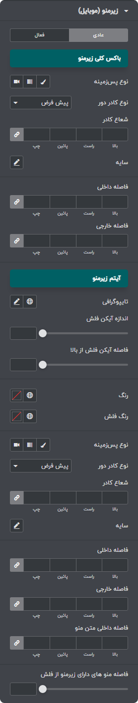 برای نمونه ما تصاویری از گزینه های سفارشی سازی المان منو را که از آن در هدر وبسایت استفاده نموده ایم را برای شما آماده کرده ایم.
